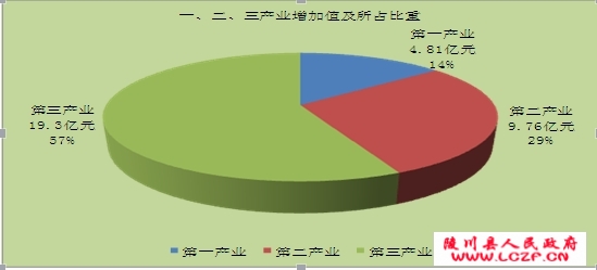 初步核算,全县地区生产总值完成33.9亿元,按可比价计算,比上年增长3%。其中:第一产业增加值完成4.81亿元,增长4.1%,占生产总值比重为14.2%;第二产业增加值完成9.76亿元,下降3.5%,占生产总值比重为28.8%;第三产业增加值完成19.3亿元,增长7.5%,占生产总值比重为56.9%。第三产业中,金融业增加值完成2.51亿元,增长14.3%;交通运输、仓储和邮政业增加值完成3.17亿元,下降5.5%;批发和零售业增加值完成1.71亿元,增长1.6%;住宿和餐饮业增加值完成0.71亿元,增长4.4%;营利性服务业增加值完成2.64亿元,下降4.9%。