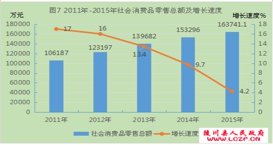 全年社会消费品零售总额163741.1万元,增长4.2%。分地域看,城镇108229.4万元,增长4.2%;乡村55511.7万元,增长4.1%。(见图7)