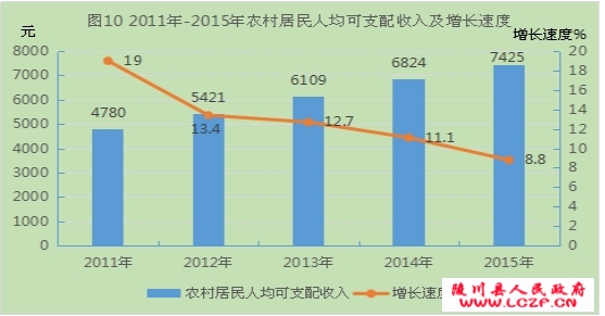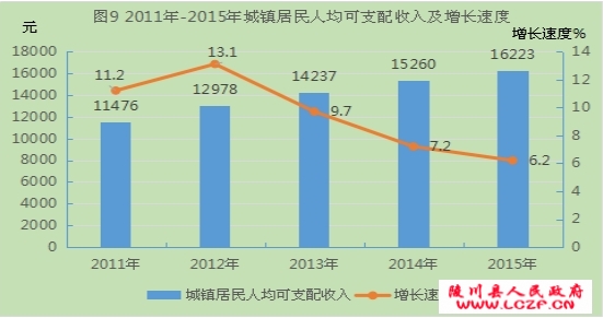 全年城乡居民人均可支配收入10566元,增长7.4%。其中:城镇居民人均可支配收入达到16223元,增长6.2%;农村居民人均可支配收入达到7425元,增长8.8%。城镇20%低收入户人均可支配收入6256元,增长9.9%;农村20%低收入户人均可支配收入2646元,增长14.7%。
