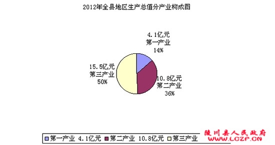 初步核算,全县地区生产总值30.39亿元,增长10%。其中:第一产业增加值4.1亿元,增长2%,占生产总值比重为13.5%;第二产业增加值10.8亿元,增长13.3%,占生产总值比重为35.6%;第三产业增加值15.5亿元,增长9.6%,占生产总值的比重为50.9%。第三产业中,金融业增加值1.63亿元,增长15.9 %;交通运输、仓储和邮政业增加值3.58亿元,增长6.7%;批发和零售业增加值1.47亿元,增长9 %;住宿和餐饮业增加值 0.69亿元,增长 5.4%;营利性服务业增加值 2.2亿元,增长15.2%。(见饼状图和图1)