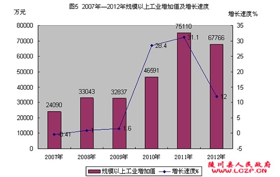 2012年末,全县规模以上工业15个,全年规模以上工业增加值67766万元,增长12%,其中:国有控股企业增长14.1%,非公有制企业增长16.4%。分轻重工业看,轻工业增长31.6%,重工业增长 9.8%(见图5)。
