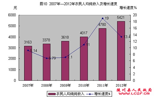 全年城镇居民人均可支配收入为12978元,增长13.1%;城镇居民人均消费性支出9036元,增长2.7 %。农村居民人均纯收入5421元,增长13.4%;农村居民人均生活消费支出4358元,增长13%。城镇占调查总户数 20 %的低收入家庭人均可支配收入4987元,增长3.1%;农村占人口20%的低收入者收入3011元,增长14.7%。城镇居民家庭恩格尔系数(即居民家庭食品消费支出占家庭消费支出的比重)22.2%,农村居民家庭恩格尔系数36%。县营以上单位在岗职工平均工资31661元,增长19.13%。县营以上单位从业人员平均劳动报酬的增长率为18.91%。(见图9、图10)