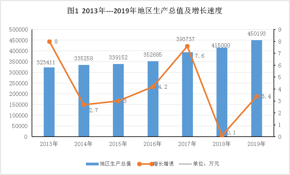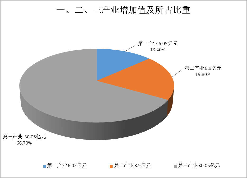 初步核算,2019年全县地区生产总值完成45亿元(现价),按可比价计算,同比增长3.4 %。其中,第一产业增加值完成6.1亿元,下降1.6%,占生产总值比重为13.4%;第二产业增加值完成8.9亿元,增长8.7%,占生产总值比重为19.8%;第三产业增加值完成30.1亿元,增长2.8%,占生产总值比重为66.7%。第三产业中,批发零售业增加值完成5.3亿元,增长1.8%;交通运输仓储业增加值完成1.1亿元,增长0.8%;住宿餐饮业增加值完成2.2亿元,增长4.3%;金融业增加值完成2.9亿元,增长9.0%;房地产业增加值完成4.6亿元,增长2.6%;其他服务业增加值完成13.8亿元,增长1.9%(见饼状图、图1)。