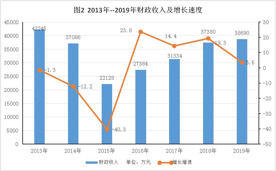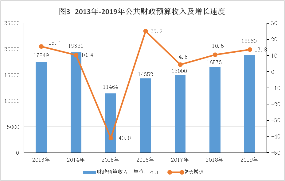 全县财政总收入完成38690万元,增长3.5%。其中增值税15248万元;企业所得税5575万元;资源税5353万元;个人所得税485万元;城市维护建设税404万元。一般公共预算收入完成18860万元,增长13.8%。一般公共预算支出达到207562万元,增长5.3%,其中:一般公共服务支出增长29.3%,公共安全支出下降2.0%,教育支出下降3.1%,节能环保支出增长71.5%,科学技术支出增长188.9%,社会保障支出增长3.1%,卫生健康支出增长7.0%,城乡社区支出下降42.1%。(见图2、图3)。