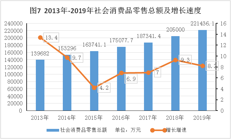 年末全县限额以上的贸易业共21个,其中批发零售业17个,住宿餐饮业4个。全年社会消费品零售总额累计完成22.1亿元,同比增长8.2%。分地域看,城镇146473.3万元,占66.1%,同比增长8.2%;乡村74962.8万元,占33.9%,同比增长8.1%。分消费形态看,餐饮收入完成26602.9万元,占12%,增长9%;商品零售完成194833.2万元,占88%,增长8%(见图7)。