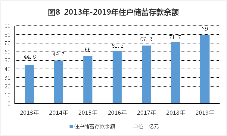 年末全县金融机构各项存款余额1048129万元,比年初增加79297万元,增长8.2%。其中:住户储蓄存款余额790308万元,比年初增加73171万元,增长10.2%;年末各项贷款余额363766万元,比年初增加108460万元,增长 42.5%(见图8)。