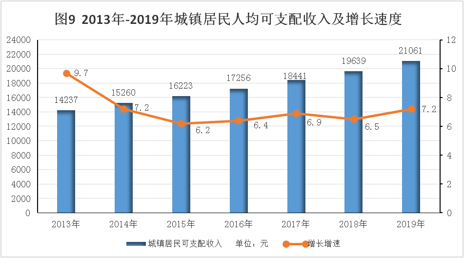 全年全县居民人均可支配收入达到14262元,增长8.3%。其中:城镇居民人均可支配收入21061元,增长7.2%;农村居民人均可支配收入10309元,增长9.9%。(见图9、图10)