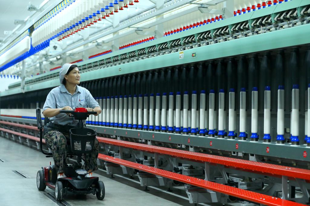 7月30日,山东省青岛市一家科技纺织企业的工人在智慧纺纱生产线上巡检。新华社发(梁孝鹏摄)